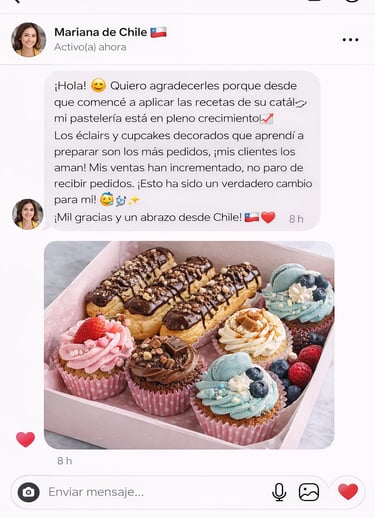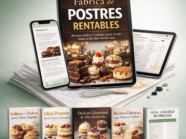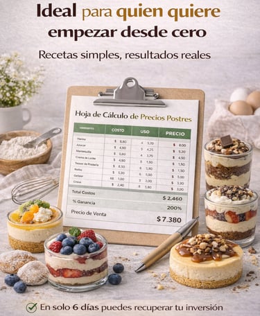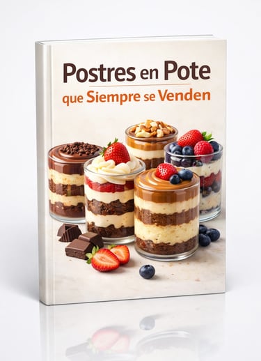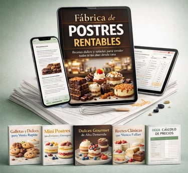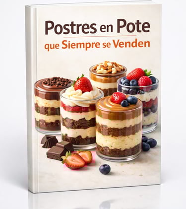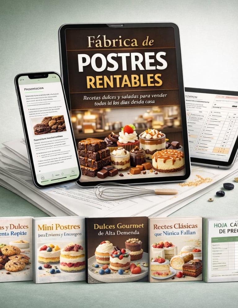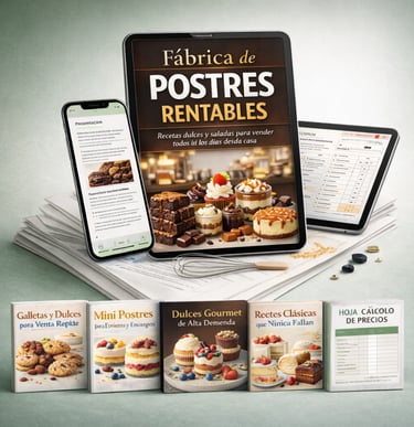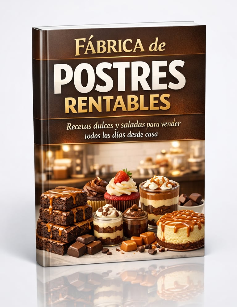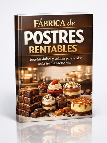 Es un ebook práctico con más de 100 recetas seleccionadas para quienes quieren vender postres de forma sencilla y rentable, incluso si están empezando desde cero.